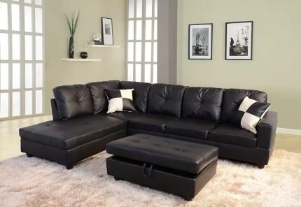 3 Pc Living Room Faux Leather Black Sectional Sofa With Storage Ottoman