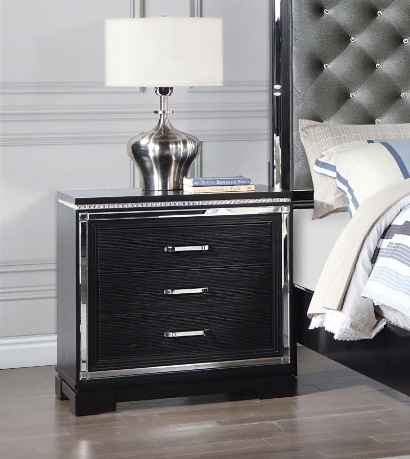 Bold, dramatic hues set the stage for clean lines and luxe details in this glam nightstand. Glimmering accents such as polished mirror trim create a border around the stacked drawers, capped with corner mirror tiles. A dark black finish offsets the polished and sparkling accents, while offering modern sensibilities like USB charging ports and a felt-lined top drawer for delicates. Along the drawer fronts is a wood grain surface that adds a hint of texture. Along the tabletop surface is a crystal-like border, mirrored also in the sleek hardware pulls.