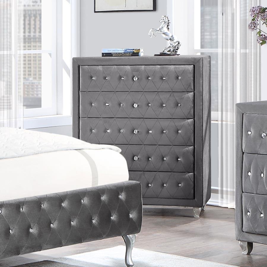 Dress up your space with chic, modern luxury. Exquisitely designed, this stylish chest makes any bedroom look more glamorous. Its front is adorned with trendy button tufting. Its frame is enhanced by a stunning, shining, grey metallic finish. With five large drawers for spacious storage, it’s as practical as it is beautiful.
