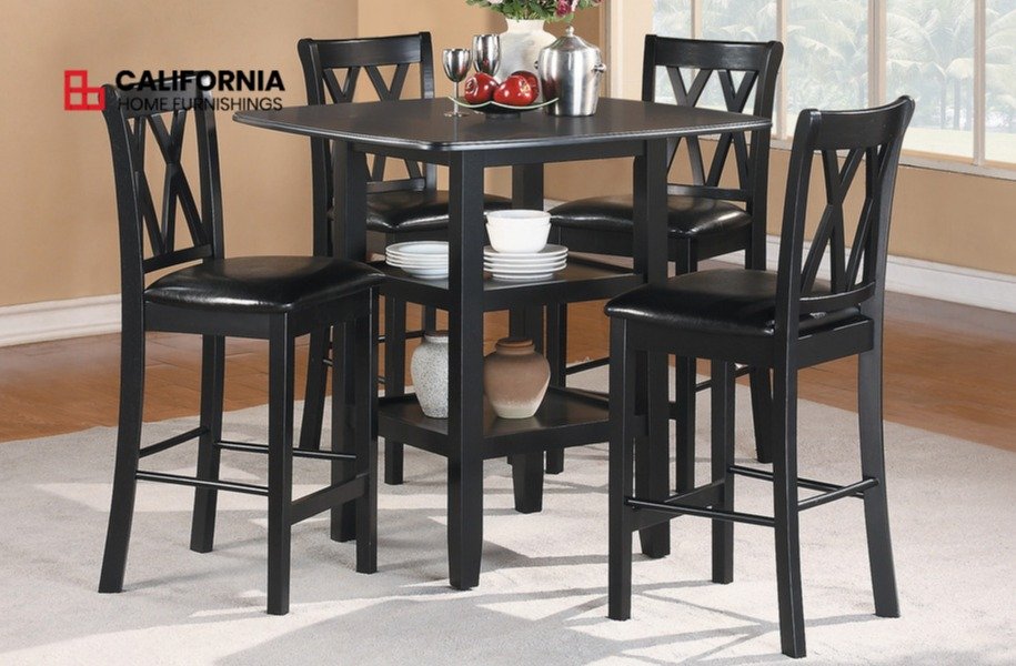 Introducing the Norman Collection 5-Piece Counter Height Dining Set from California Home Furnishings. Perfectly designed for cozy dining areas, this stylish set includes a counter height table with double display shelves for ample storage and display space. The sleek black finish and double X-back chairs add a touch of transitional elegance, making it an ideal choice for any casual dining room.