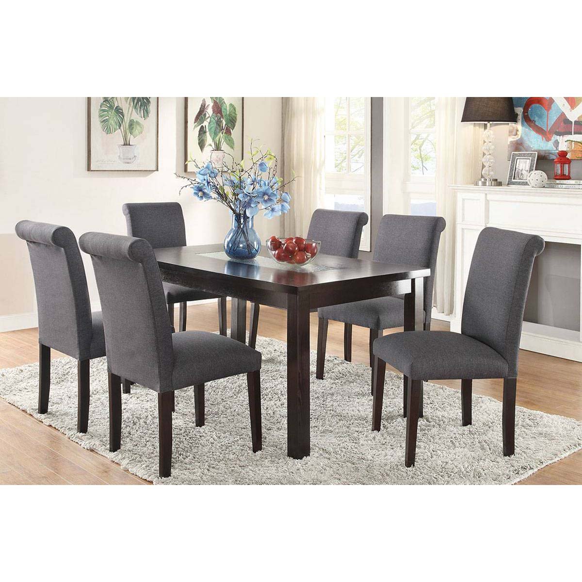 Blue Grey Dining Chair. Spice up your dining area with the colorful seating found on the watercolor side chair. Blended poly fiber upholstery in blue-grey or ash black is supple, durable, and easy to clean. The stitching detail enhances the back of the chair. A padded seat and espresso-finished wood legs provide support.