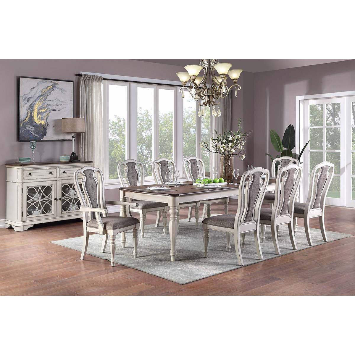 Divine Wood Dining Table. This extravagant yet elegant dining set can comfortably fit all your family members on occasion. Such as Thanksgiving or Christmas. Made with divine wood, the tabletop paired with well-crafted table legs is what makes this collection sophisticated. The artistic engraving on the chair is a simple yet detailed touch to this beautiful collection. with the matching server that can store your dining essentials, this wooden dining set is an exquisite complete collection for you.