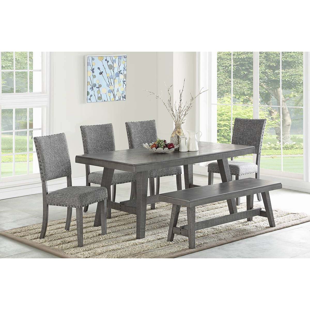 Fine Wood Dining Table Set. Made with solid fine wood material, this breathtaking dining set includes a bench, table, and four dining chairs that give your dining area a classic and stylish look. The chairs have beautiful carved frames and cushions that are enjoyable to sit on with your friends while having a wine night. Crafted from high-quality material, this beautifully made dining set is a must-have for any household.