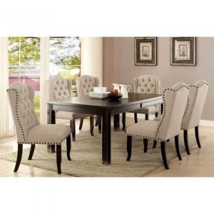 Rustic charm meets upscale design in the form of this stunning collection. The rustic wood grain and antique black finish take you to a charming farmhouse somewhere in the countryside, achieving an inviting, homey atmosphere that will have family and friends coming back for more. Elegant linen-like chairs add sophisticated appeal with their wingback sides, button tufting and nailhead trim.