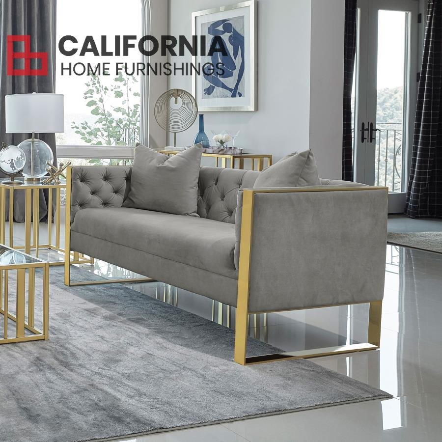 * Light grey velvet upholstery accented with a gold stainless steel arm base