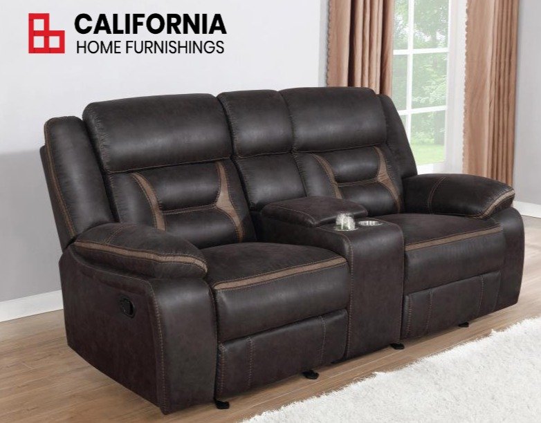 Transform your entertainment space with our Upholstered Tufted Back Glider Loveseat from California Home Furnishings. This glider loveseat, upholstered in rich brown leatherette, brings together style and comfort to create the perfect seating solution for your home. The manual reclining seats allow you to customize your lounging experience, while the light brown contrast details and dark brown contrast stitching add a touch of sophistication.